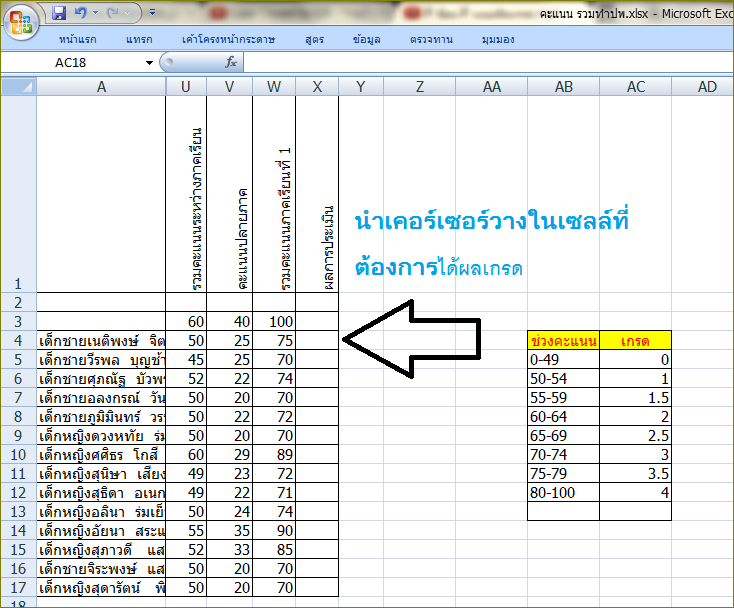 นำเมาส์คลิ๊กที่เซลล์ W แล้วคลิีกที่ แถบสูตร fx วางสูตร IF ลงไปแล้วคลิ๊ก Enter ก็จะได้ค่าคะแนนของนักเรียนคนแรก ต่อจากนั้นนักเรียนคนถัด ๆ ไปใช้วิธี Copy สูตร ไปวางใน เซลล์ที่ต้องการได้ผลการคำนวณ ก็จะปรากฏเกรดที่เราต้องการทราบ และในเซลล์อื่น ๆ ก็เพียงแค่เปลี่ยน ชื่อ เซลล์เท่านั้น เช่น W5,W6 เป็นต้น
