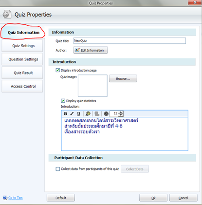 มาคลิ๊กที่เมนู quiz properties ที่เมนูด้านบน เพื่อปรับแต่งคุณลักษณะของแบบทดสอบที่เราจะสร้าง